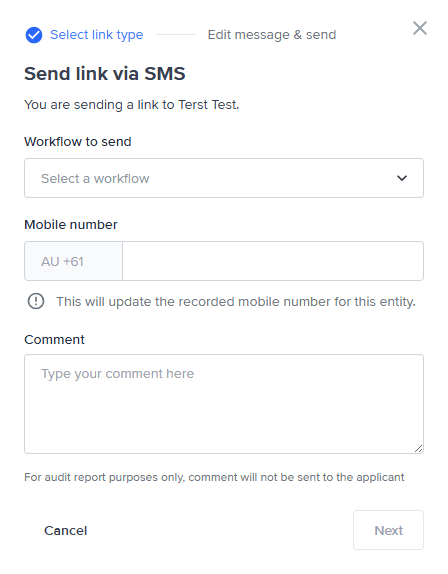 This will open the Send link via SMS modal where you can set the workflow to send, the mobile number of the applicant, and any comment you want to add to the audit event associated with sending the link (this comment isn’t sent to the customers).