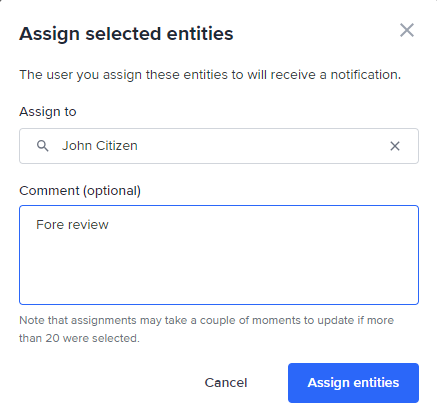 Afterwards, select Assign entities. The new assignments will appear under the Assignee column on the Entities page.