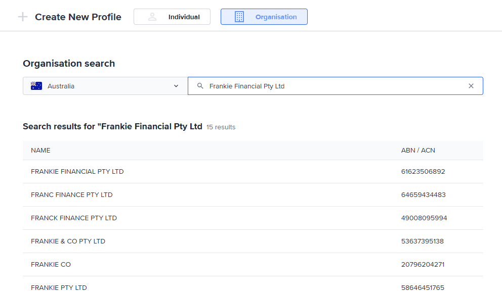 This will Search the ABR (Australian Business Register) and display options in the dropdown.
