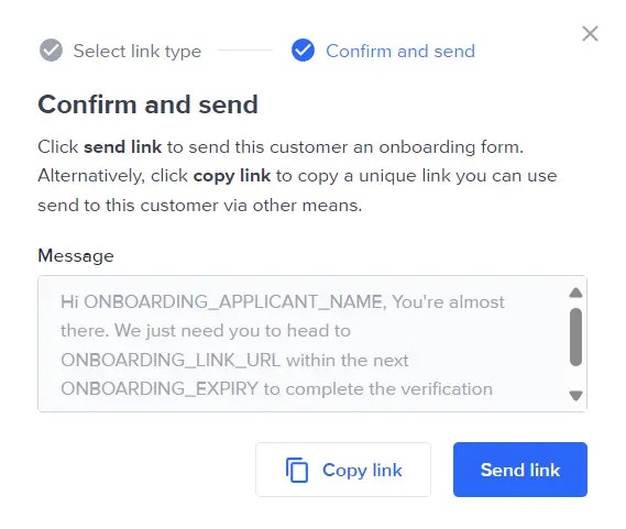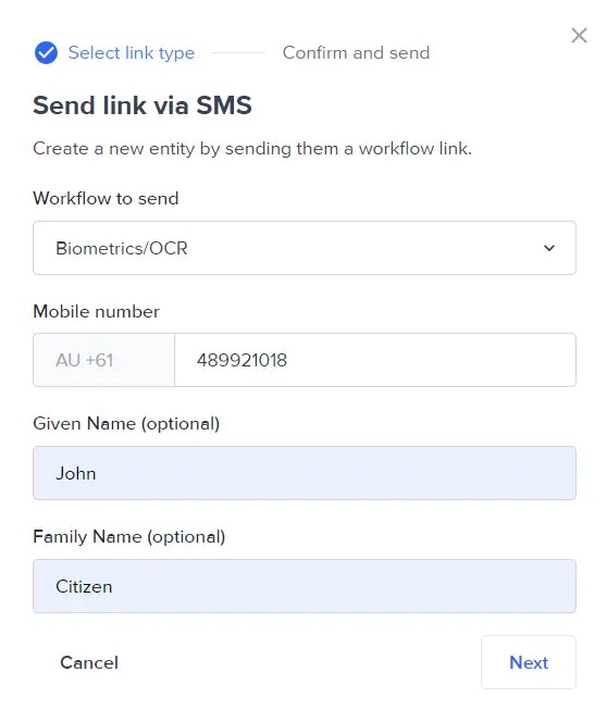 Select the Workflow to send from the drop-down. Common options include Biometrics/OCR or OCR only.3. Click Next – Choose Send Link or Copy Link