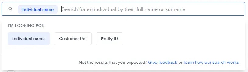 - Select the type of entity identifier type, whether it’s the Individual name, Customer Ref, or Entity ID. By default, Individual name is selected.