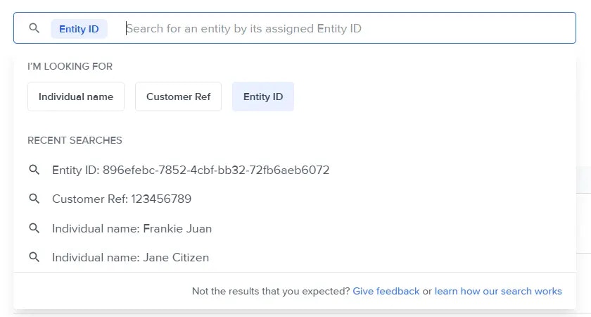 The FrankieOne Portal provides a convenient way to search for entities. A Search bar appears at the top of every page.Video Guide