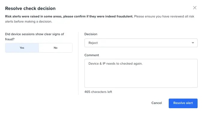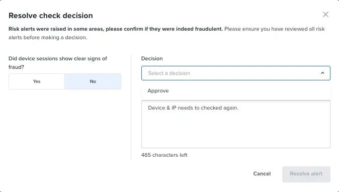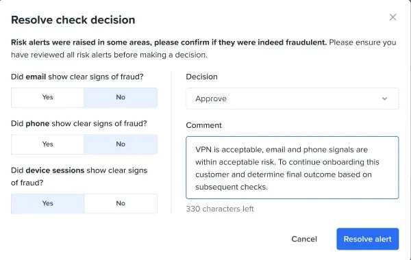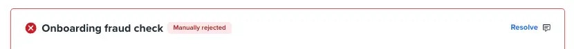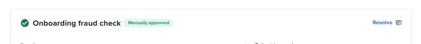 You can resolve issues by selecting the Resolve button on the right side of the onboarding fraud check container. There may be cases where the resolve button is not visible. This is because there are no PROs that need to be resolved, meaning the email, phone, device, and IP sections are all cleared and nothing needs to be resolved. If all of the checks need to be resolved, Selecting the Resolve link will open a modal. Decide whether to approve or reject and add a comment.