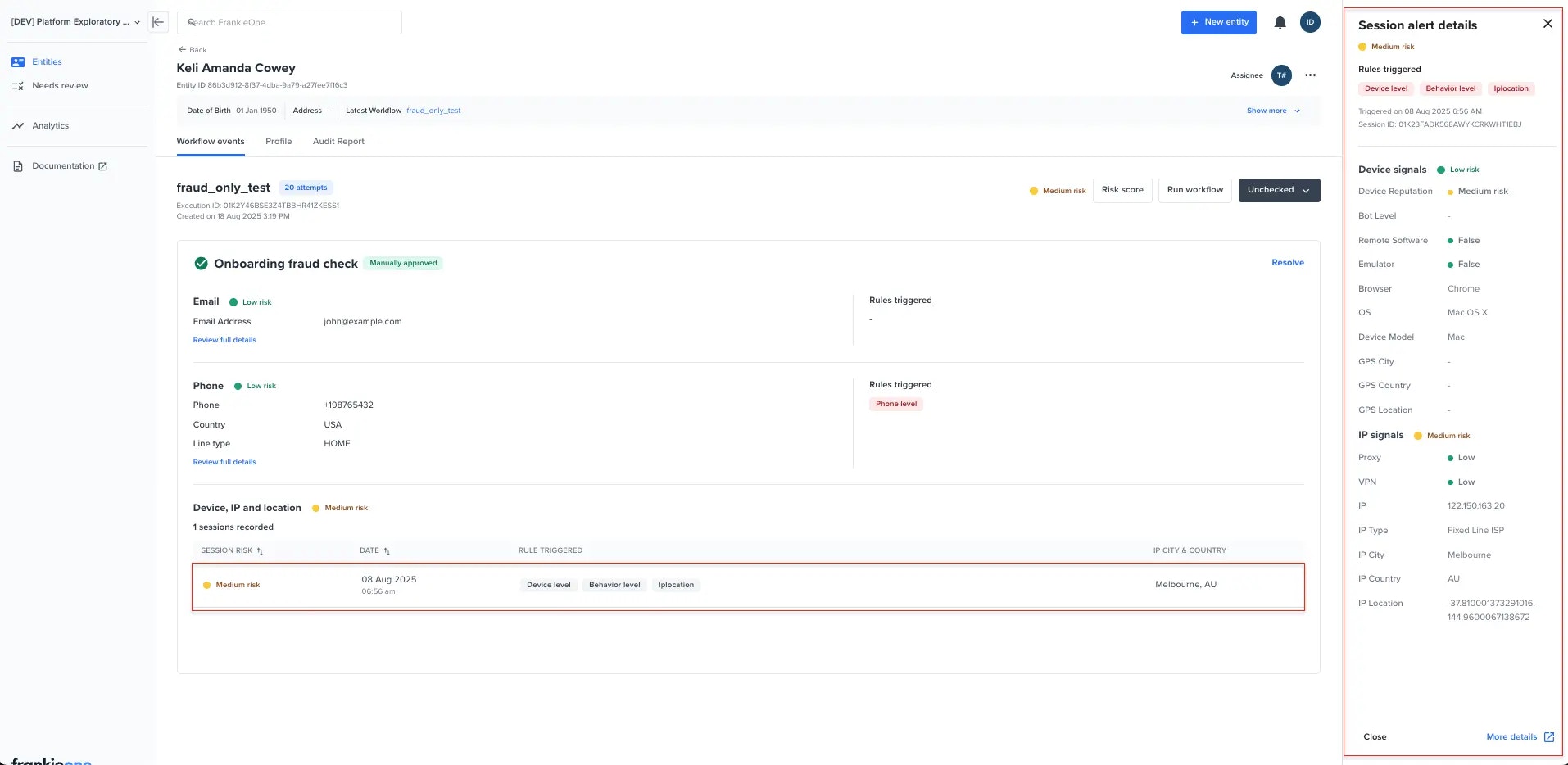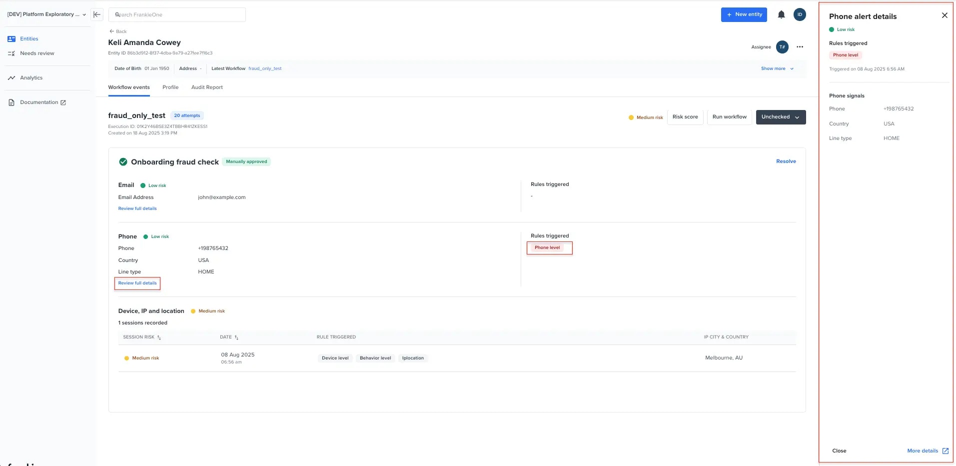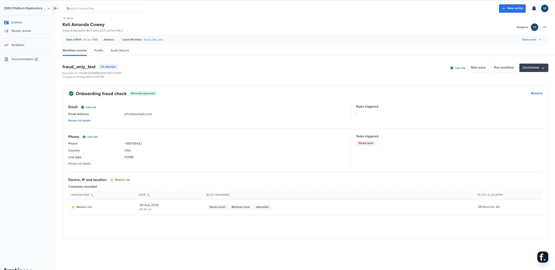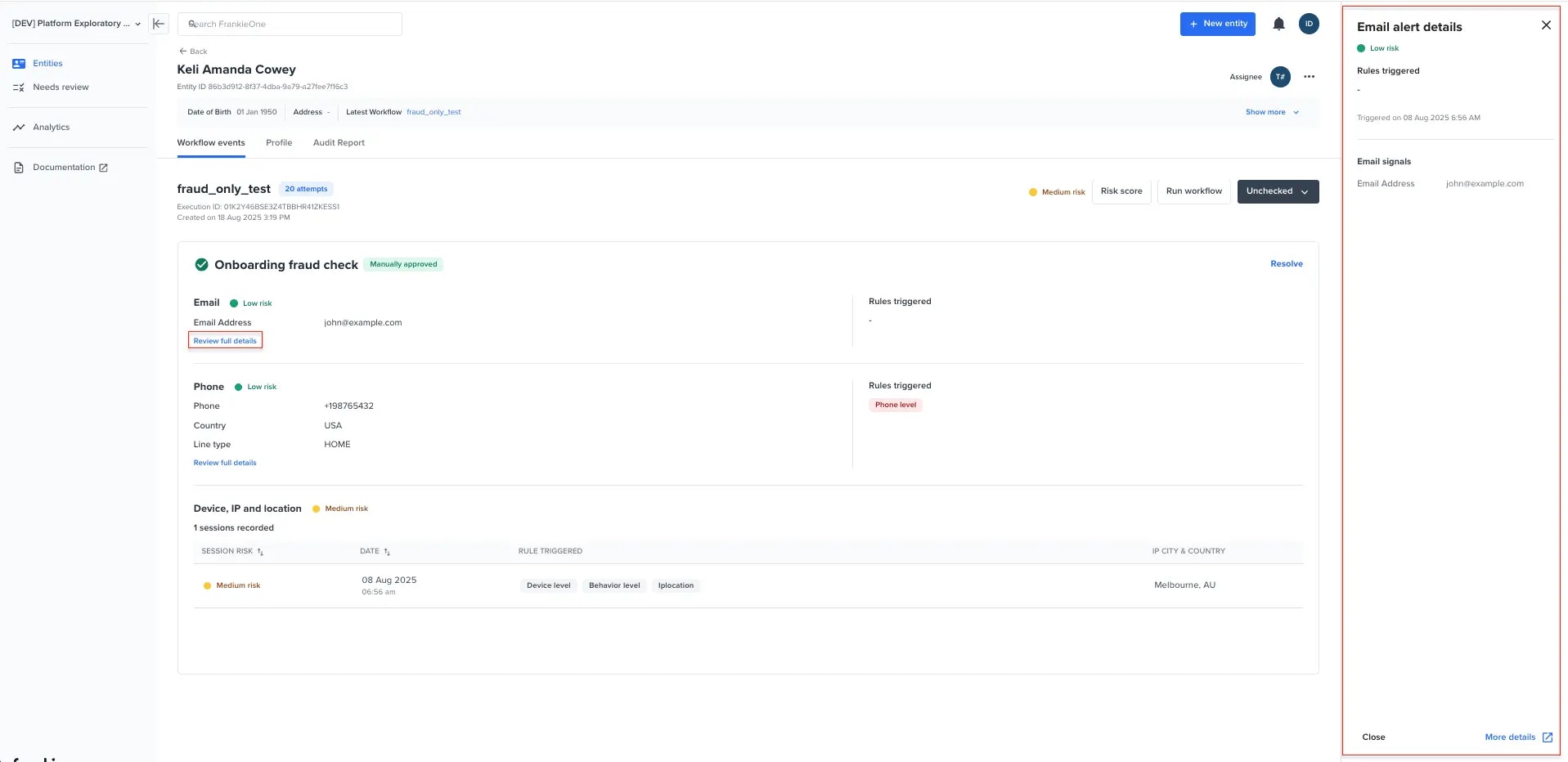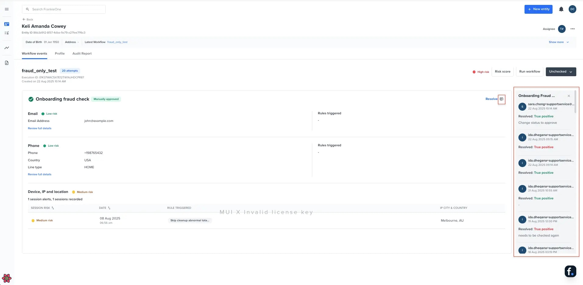 After the customer or entity has run the onboarding check, you can view any fraud-related issues in the workflow events tab. If there are any alerts found, these may include risks or issues related to email, phone, device, or IP checks. These alerts can be resolved individually.Reviewing Fraud Check Results