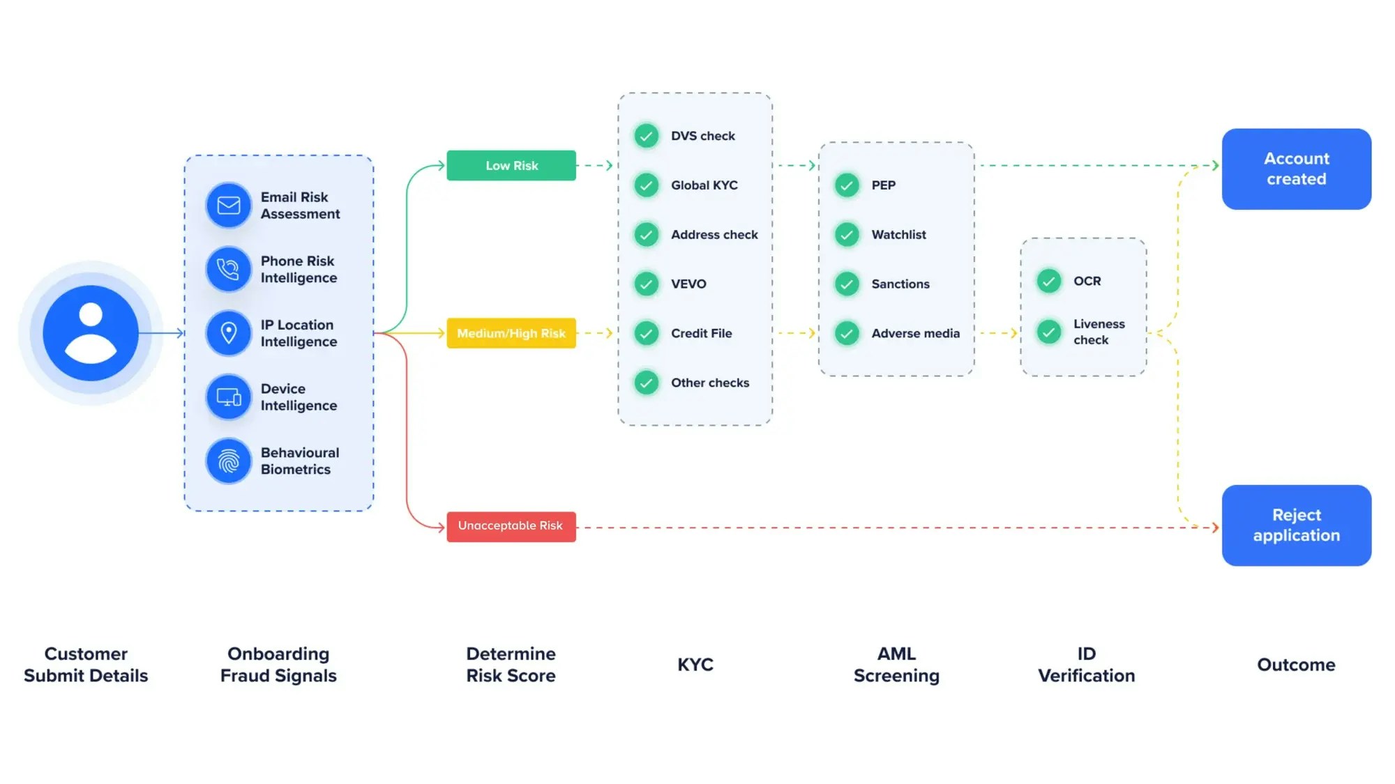 Apply Dynamic Verification The user’s journey adapts based on their risk level.Low-Risk users proceed with minimal checks and can be onboarded quickly.Medium/High-Risk users are prompted for additional verification steps, such as KYC checks, ID validation, or biometrics.Very High-Risk applications can be rejected immediately, stopping bad actors before they create an account.