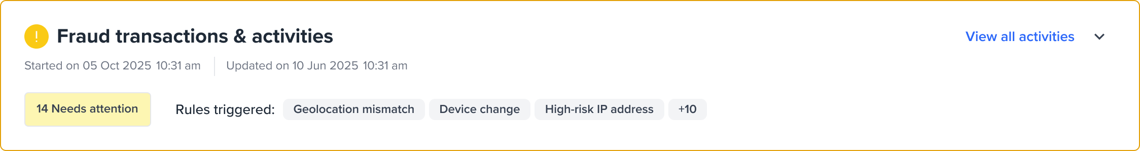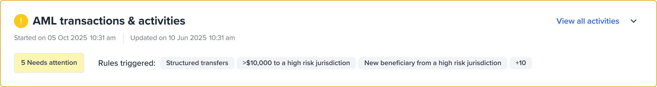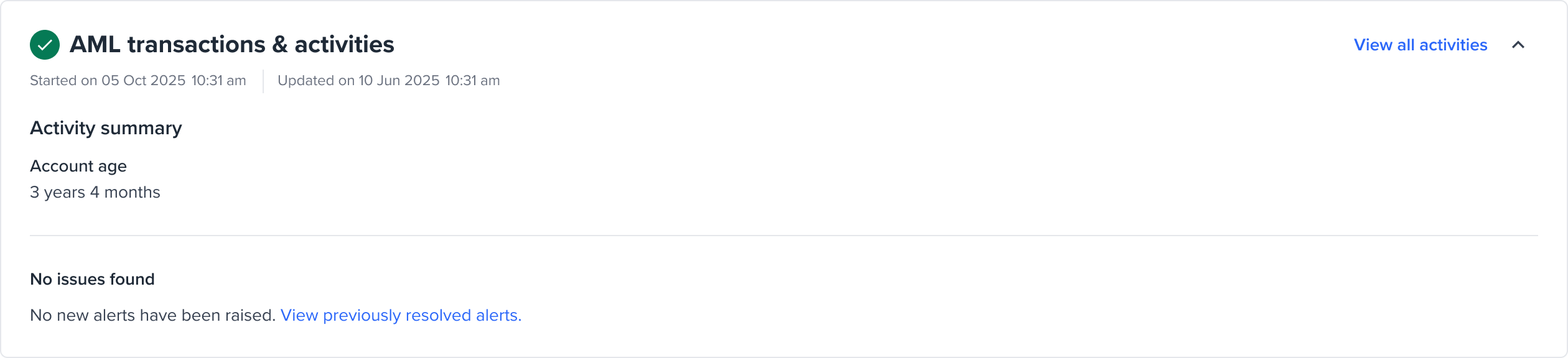 For Transaction and Activity Monitoring, this might include flags of different types for unusual transaction patterns, device anomalies, or AML concerns with issueCategory: ACTIVITY. The Portal will display these as “Activity” as seen in the image below.
