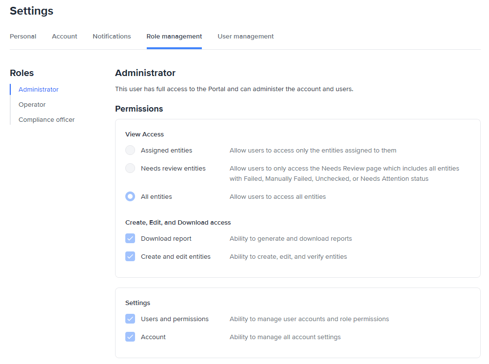 | Permission | Administrator | Operator | Compliance officer |