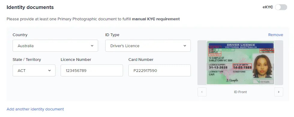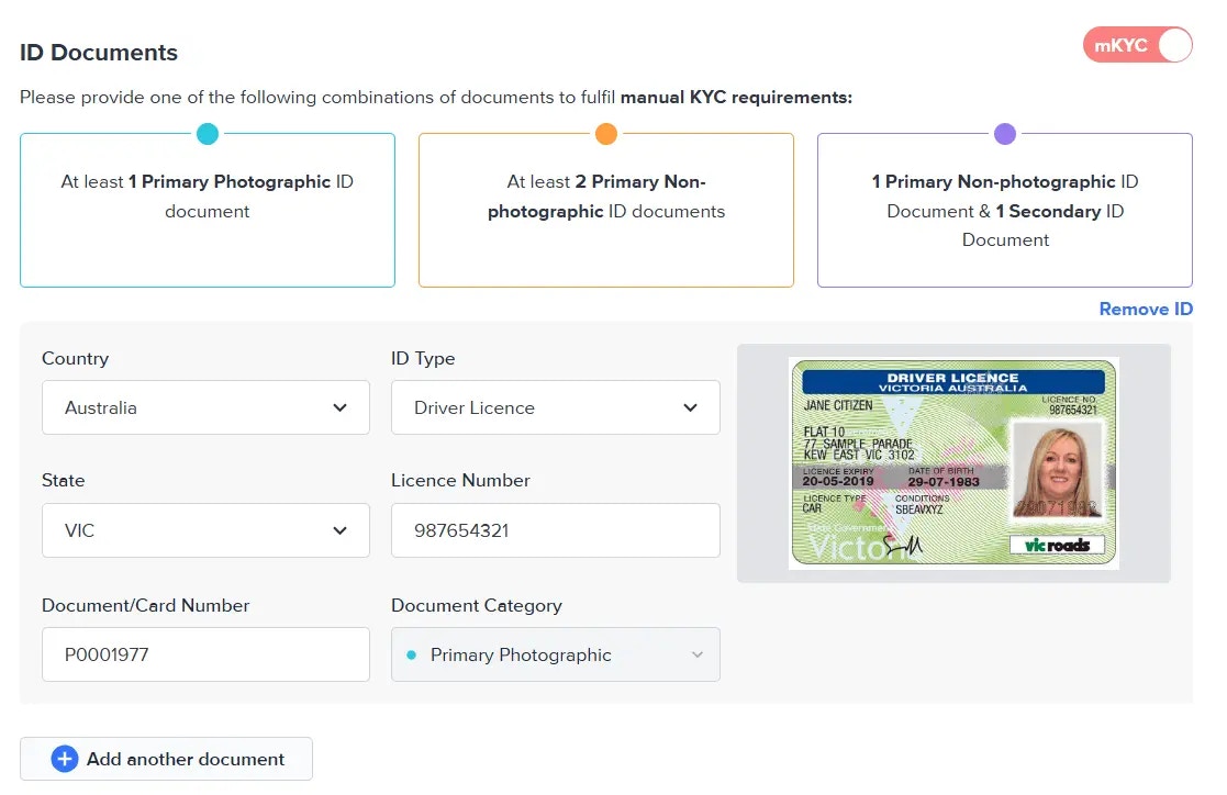 This will enable mKYC. Select the Add another document button to enter identification documents.