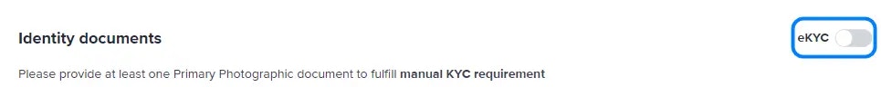 Please provide one of the following combinations of documents to fulfill manual KYC requirements:- At least 1 Primary Photographic ID document,