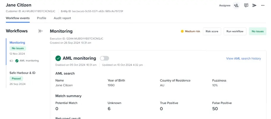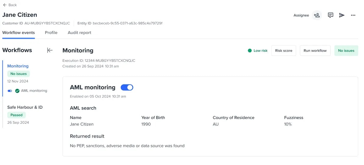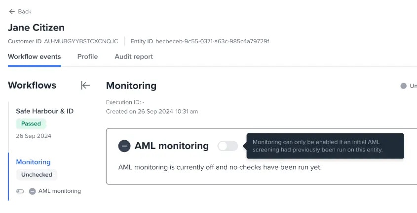 This capability allows you to continuously check an entity’s profile or activity. Monitoring is allowed for AML checks.Enabling monitoring to an entity