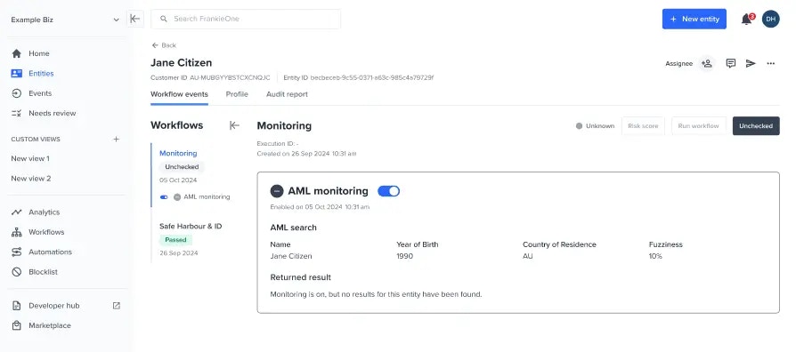 This only applies to onboarding workflows with AML step/checks configured. By default, when an onboarding workflow has passed the Monitoring workflow’s AML monitoring will be automatically enabled. Reach out Frankie support for any customisation.
