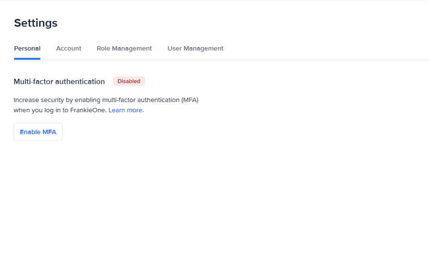 In the Settings page, select the Enable MFA button to open the Enable multi-factor authentication modal.