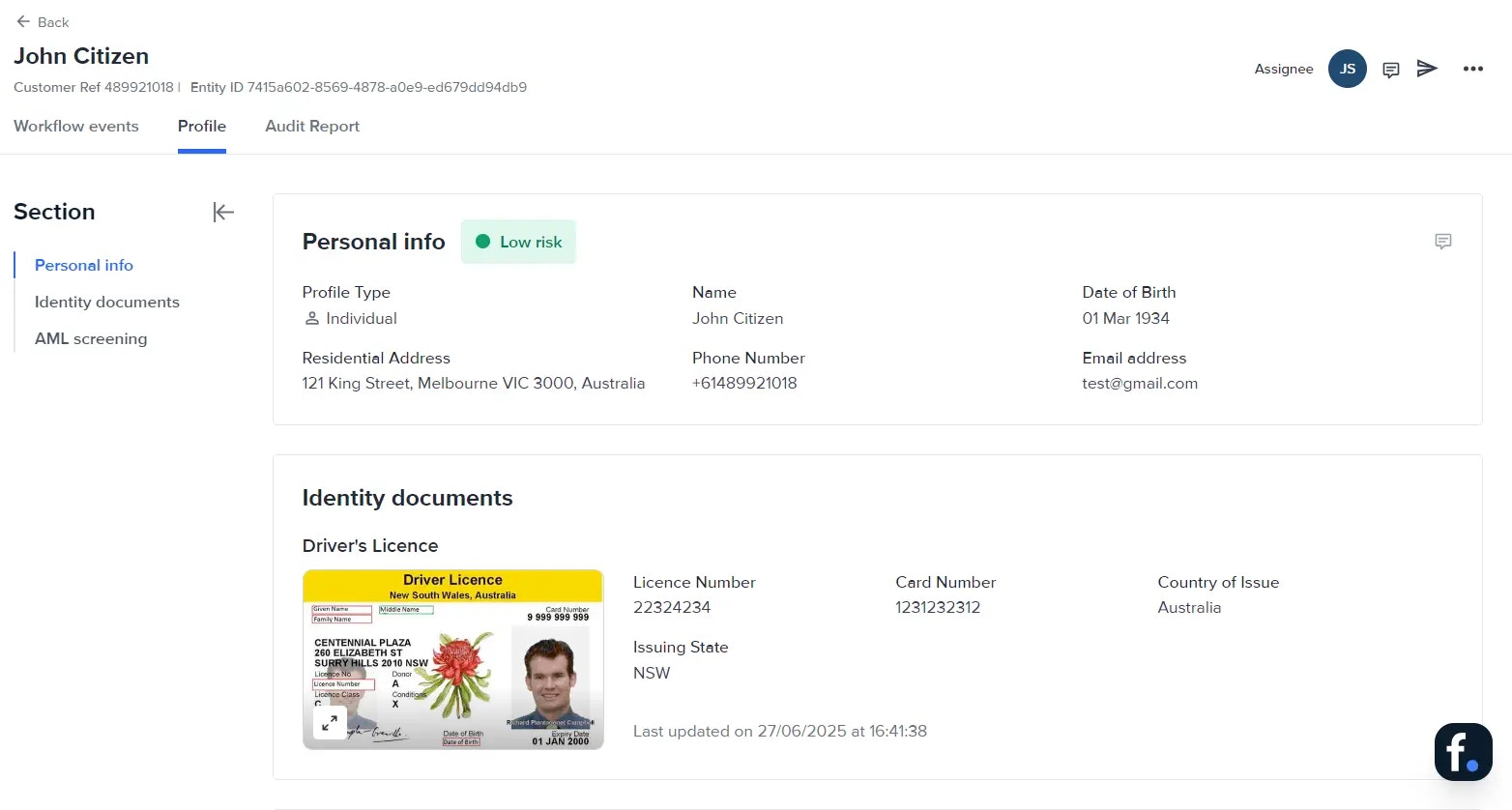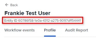 Use the Entity ID found below the entity name on the Profile tab when speaking with our customer support team. The type and order of checks that have been run on a particular customer are defined in the Workflow assigned to that entity.
