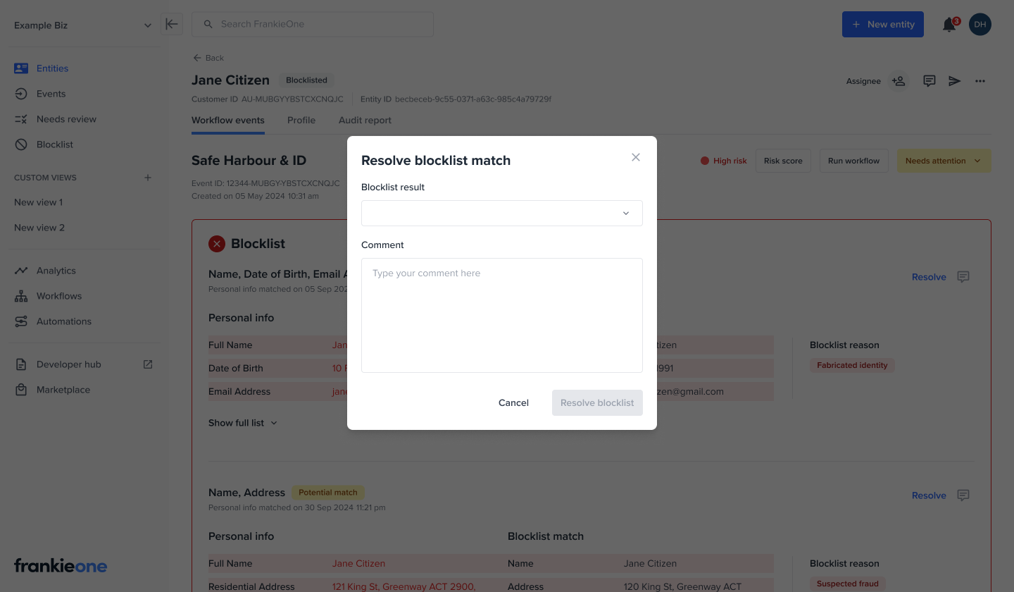 - Review the Match: The system displays both the incoming applicant’s information and the blocklisted profile side by side in the FrankieOne portal. These matches are initially indicated as Potential match.