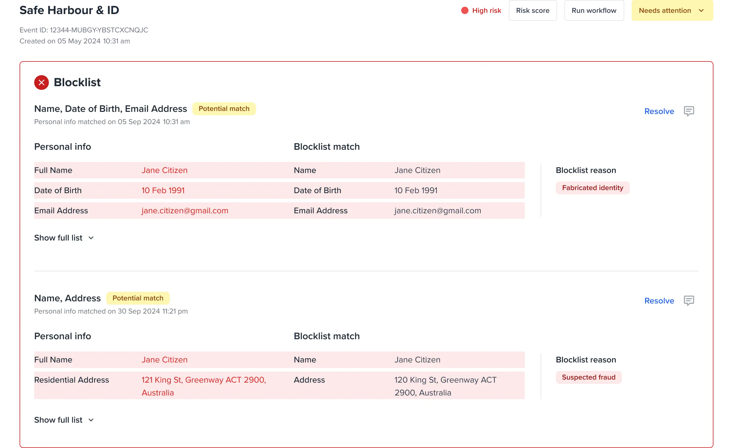 - Highlights - these are the fields that matched for both Personal info and Blocklist match