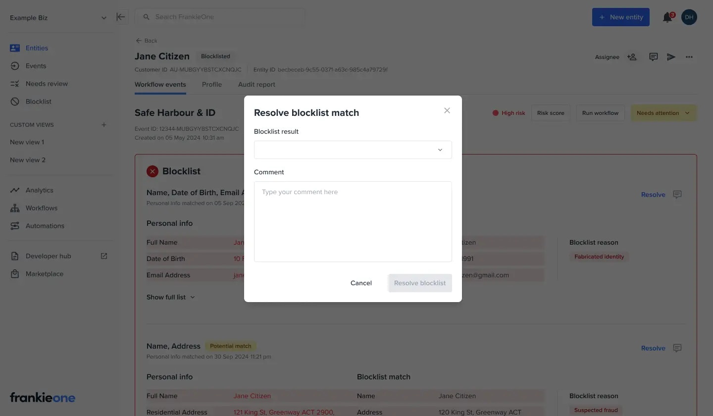 If a potential blocklist match has been found, the blocklist check indicator turns red and user action is required to either confirm or remove the potential blocklist match.- Review the Match: The system displays both the incoming applicant’s information and the blocklisted profile side by side in the FrankieOne portal. These matches are initially indicated as Potential match.