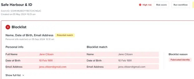 When an applicant submits their information, the system performs a blocklist check by matching the provided data against entries in the internal blocklist. The results will be seen as below while the process is governed by configurable matching rules/entries and risk scoring to determine the likelihood of a match.