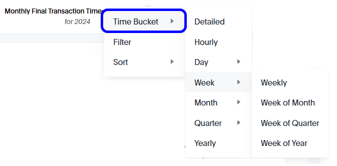You can select the view options at the top of the Analytics page. You can set the following:- Final Transaction Timestamp TZ - this option sets the period or date range to display