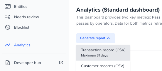 - The Generate report capability is still available for both tabs, and the transaction and customer records extracts are available for download.