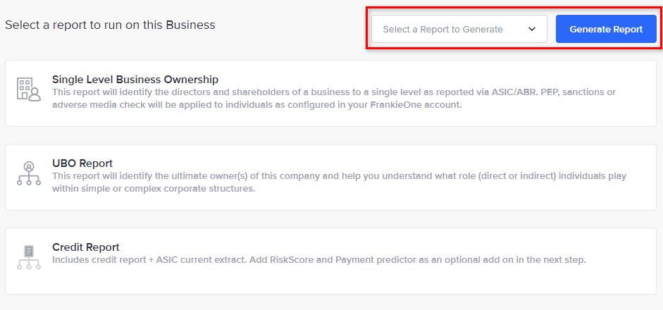 | PEP/Sanction + Adverse Media | - Runs a PEP/Sanctions/Adverse Media check on the selected business as per your FrankieOne account configuration. | - International Business (using name only) - Sole Traders - Partnerships - Australian Private and Public Companies |