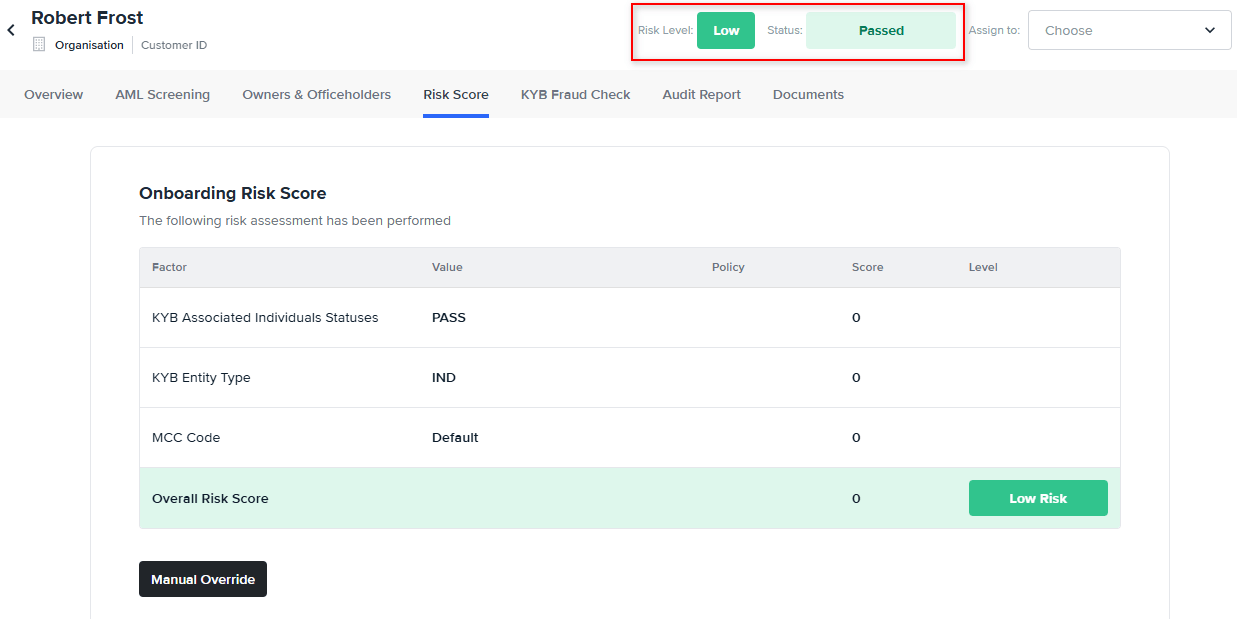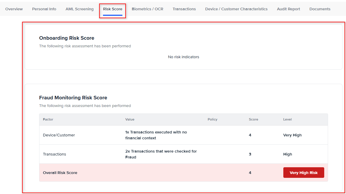 | Unacceptable | An unacceptable risk level will push the customer profile into a ‘Failed’ state with the ‘Score’ issue tag |