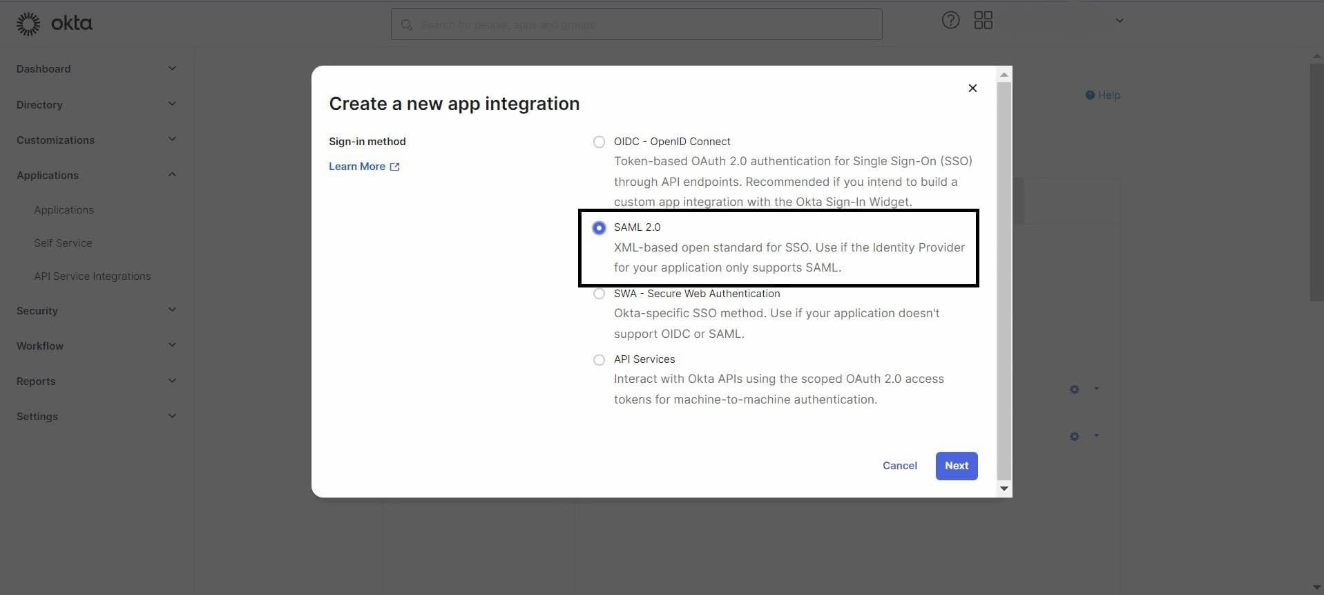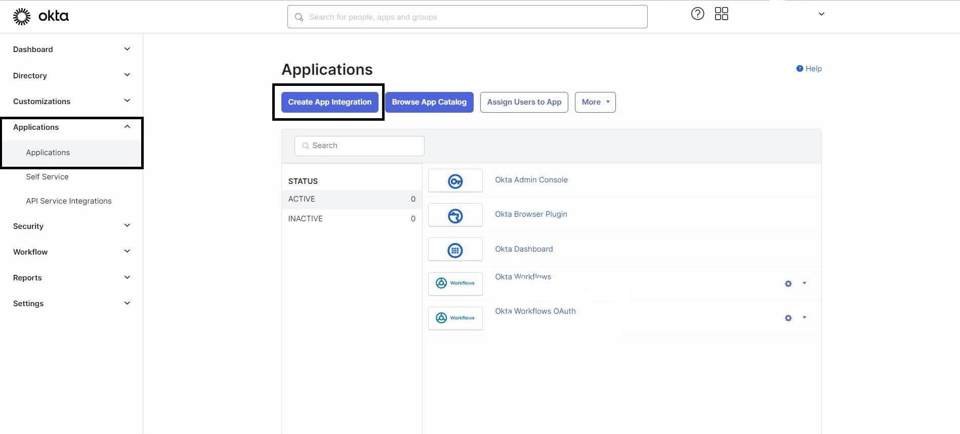 - Navigate to the Okta Admin Dashboard > Applications > Applications > Create App Integration.
