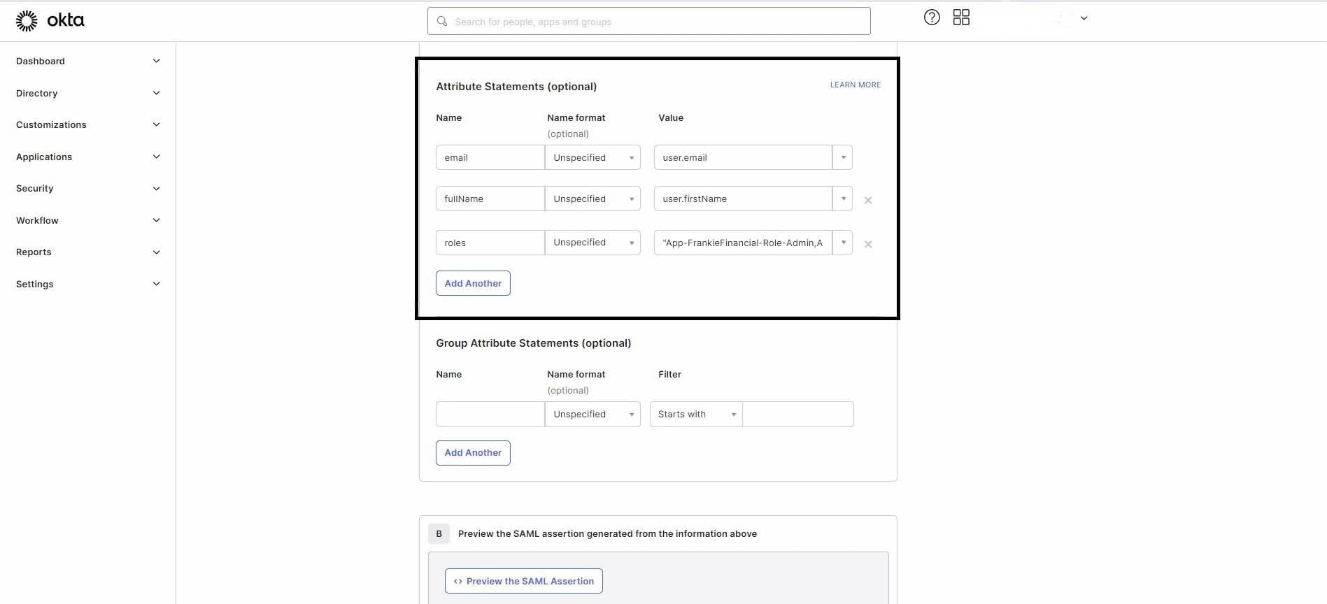 - In the Attribute Statements (optional) section, add attributes as shown in the screenshot.