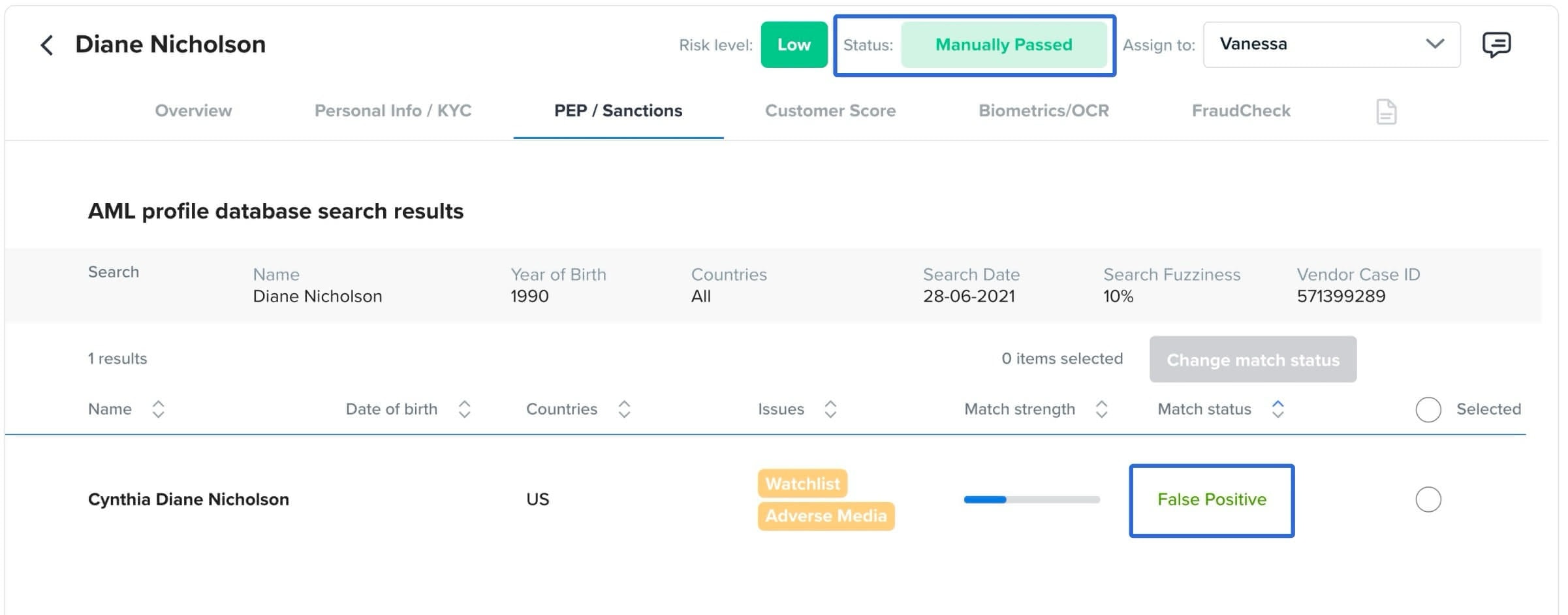 Once a decision has been made, update the match status to either confirm the match or mark it as a false positive.