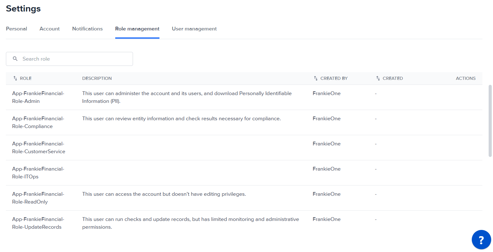 Skip to main contentYou can configure your FrankieOne Portal to have any number of different roles to cater to different permissions levels within your organization.