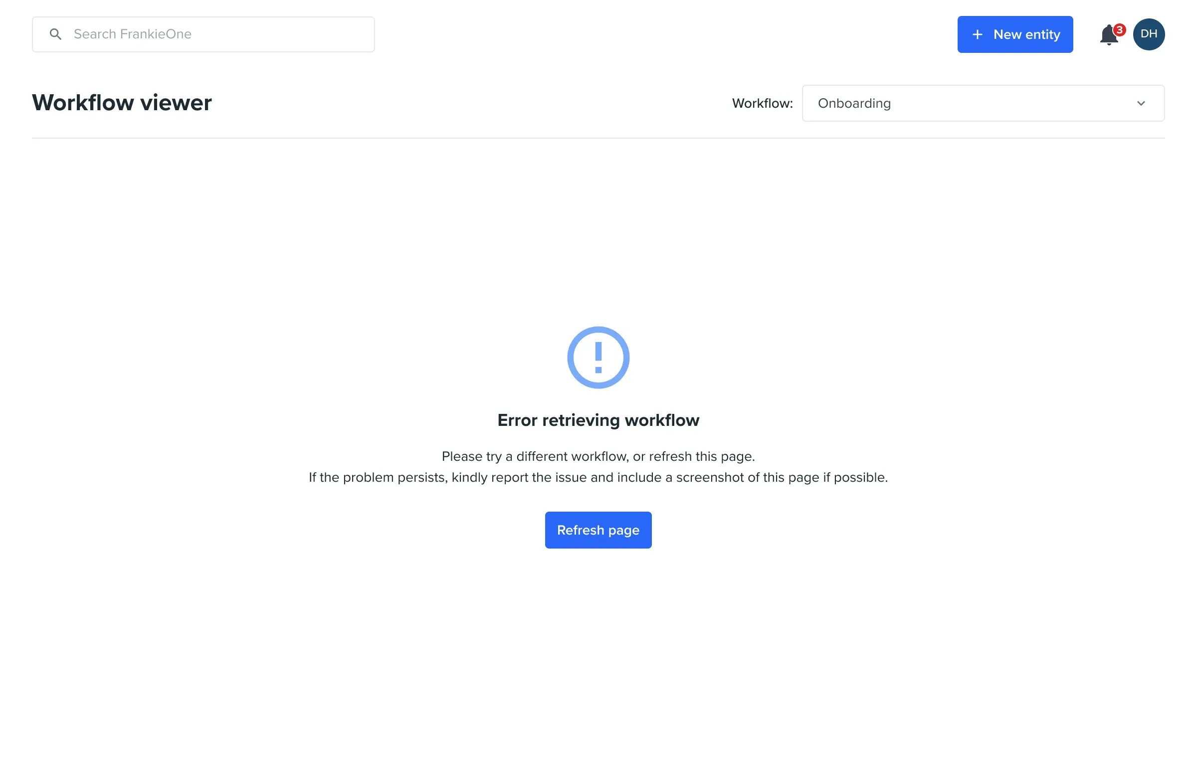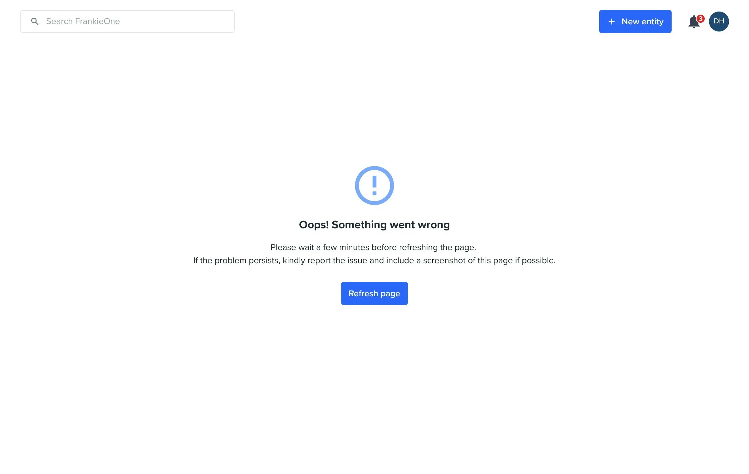 Recommended action: It is advised to refresh the page after some time or reach out to FrankieOne if issue persists.