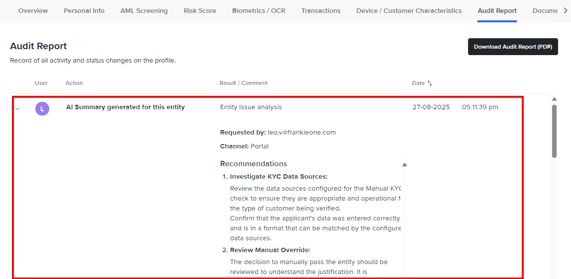 Each summary trigger is recorded in FrankieOne Audit Logs for a complete compliance trail.