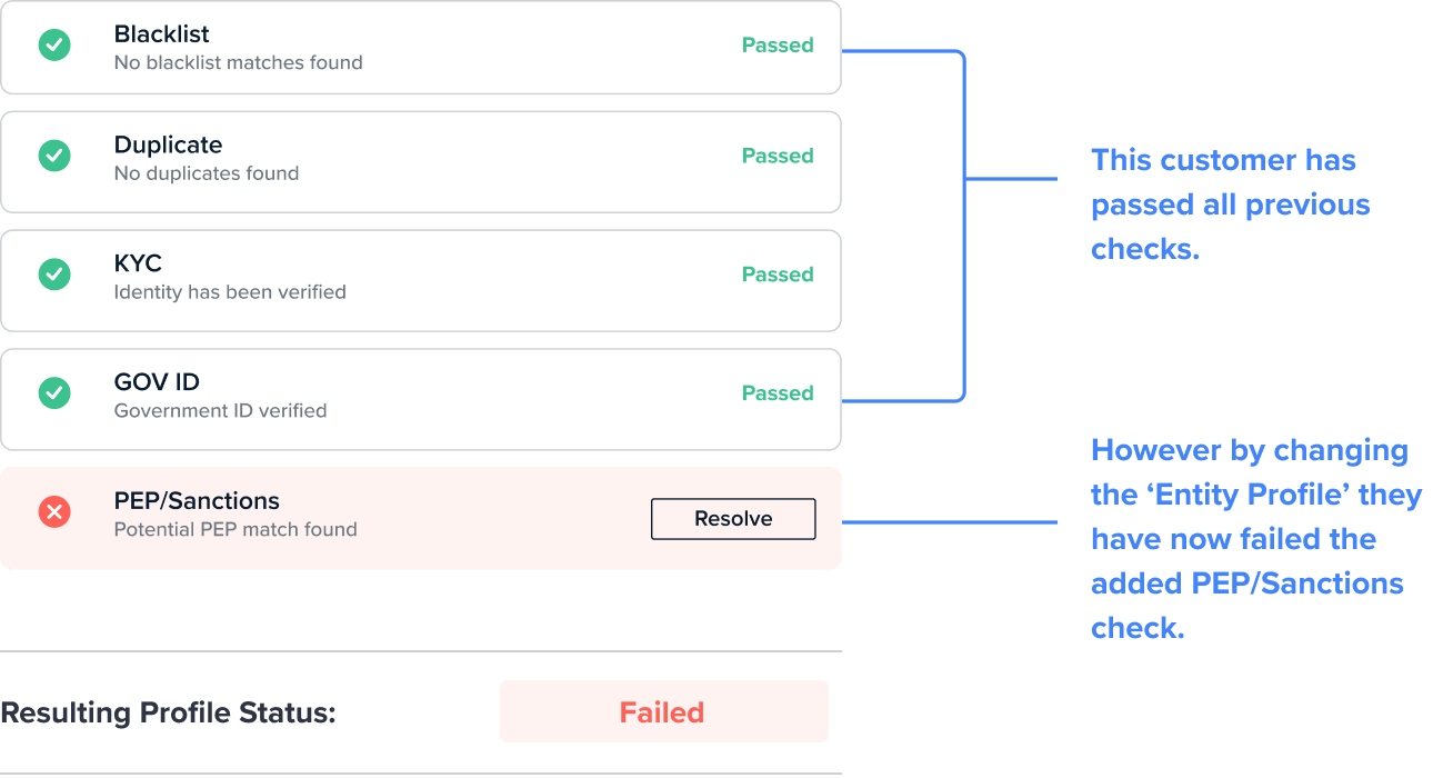 Additional checks are required as part of this Recipe, however, because the customer has already passed the same 4 checks from the first Recipe, these are counted towards the final result and only the single additional PEP/Sanctions check is run.