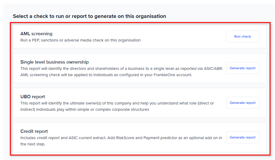 Select the business you would like to run checks on. This will show a summary of the information found on ABR to ensure you are running checks on the correct company.