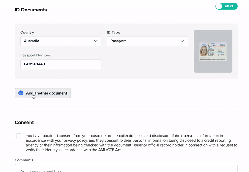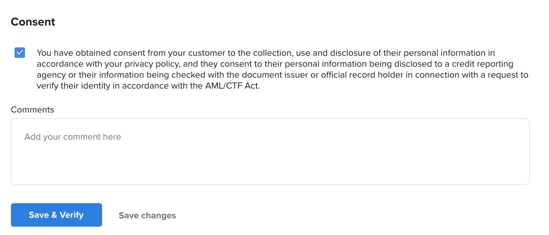 You must obtain Consent from your customer as per the AML/CTF act to run certain checks. You won’t be able to Save and Verify where consent is required as part of the selected Recipe.
