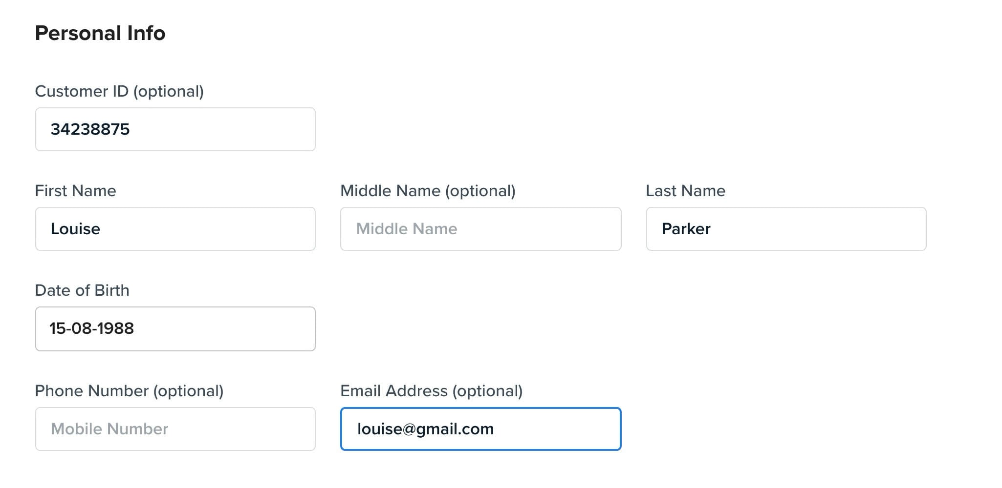 Use the form fields to enter the customer’s personal information. Fields will be optional or required based on the recipe and your FrankieOne configuration.