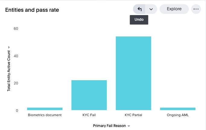 The Individual tab contains information on pass rates, and primary fail reasons for your customers. Here, you can find visualisations filtered on Individuals Only using the “Latest Entity Data Asset”. The ID Checks Data Asset is also used to run Government ID checks.