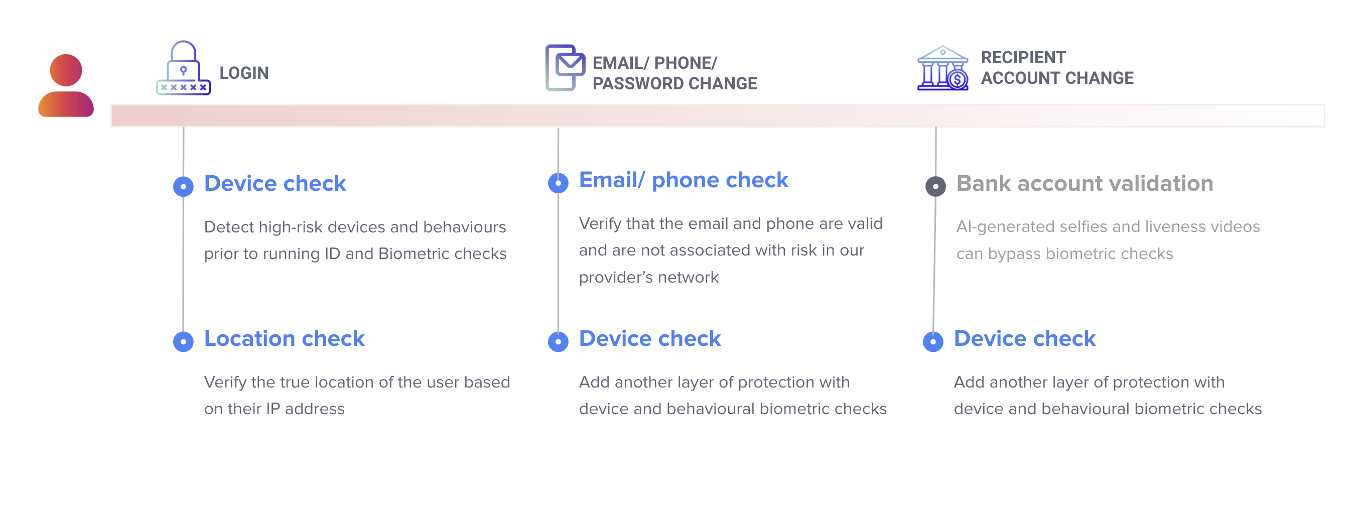 - Onboarding Fraud Check which verifies the risk of your user’s email, phone, and device at the point of Onboarding