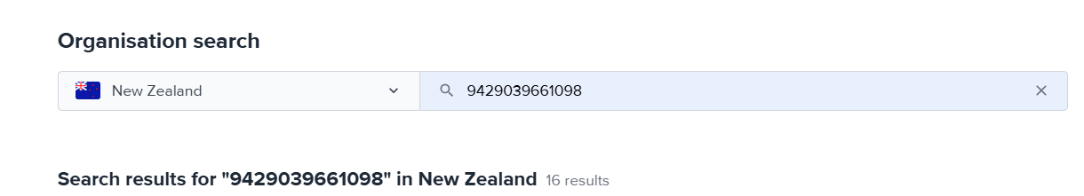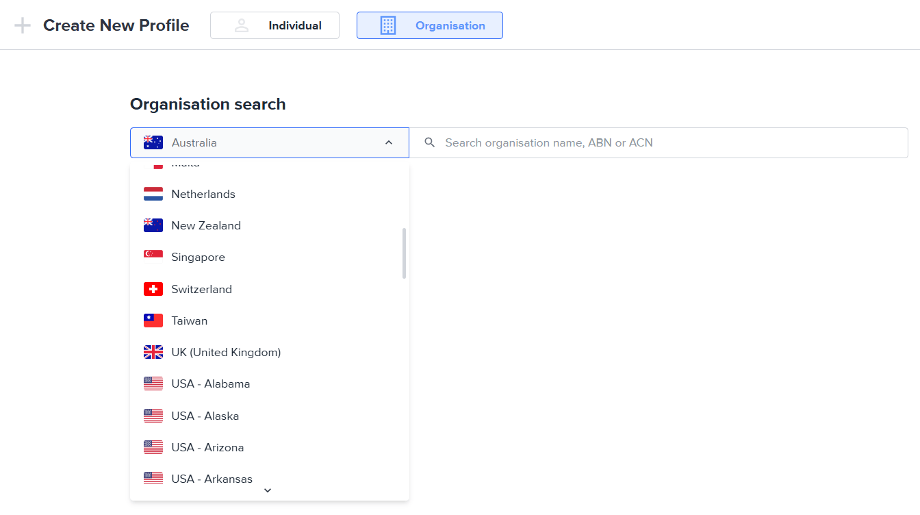 When creating a new organisation select the country from the drop-down in the search and search with the organisation name or registration number.