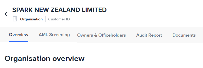 On the organisation entity you can access the entity’s overview, the AML screening results, The owners and Officeholders of the entity, any audit events, and the documents saved on the entity.