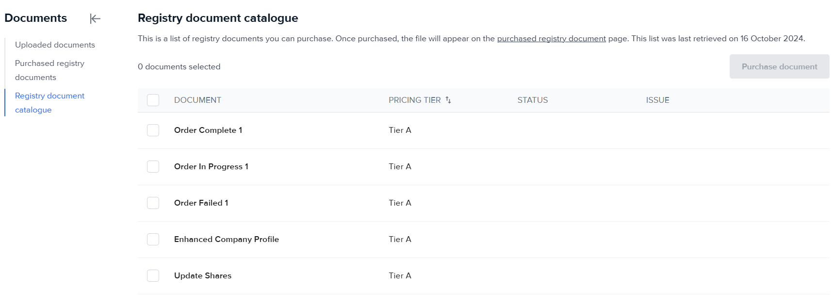 Additionally, on the Documents tab, you can review any registry documents available on the entity with the registry, purchase them, and view any that have been purchased.