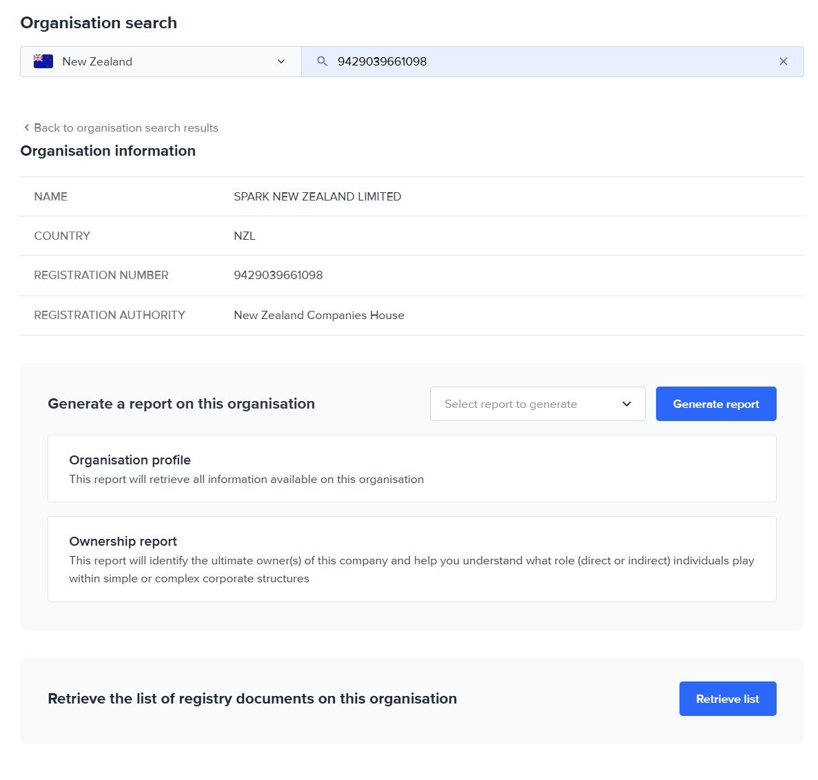 On the entity, you can perform AML screening, generate an organisation profile or an ownership report, or retrieve a list of all registry documents available on the organisation.