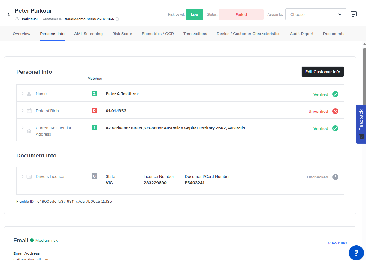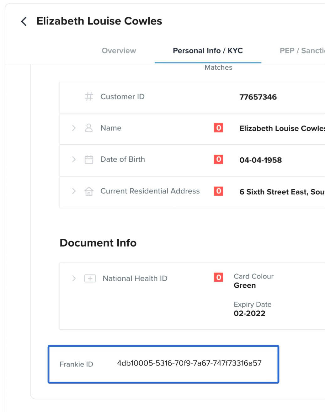 Use the FrankieOne ID found at the bottom of the KYC personal info tab as a reference when speaking with our customer support team.