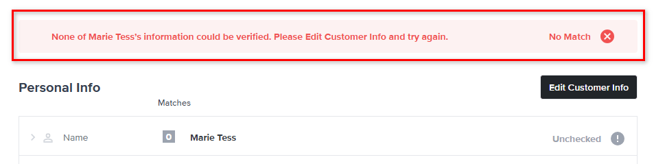 Click Edit Customer Info to update the customer details and Save & Verify to re-run checks.