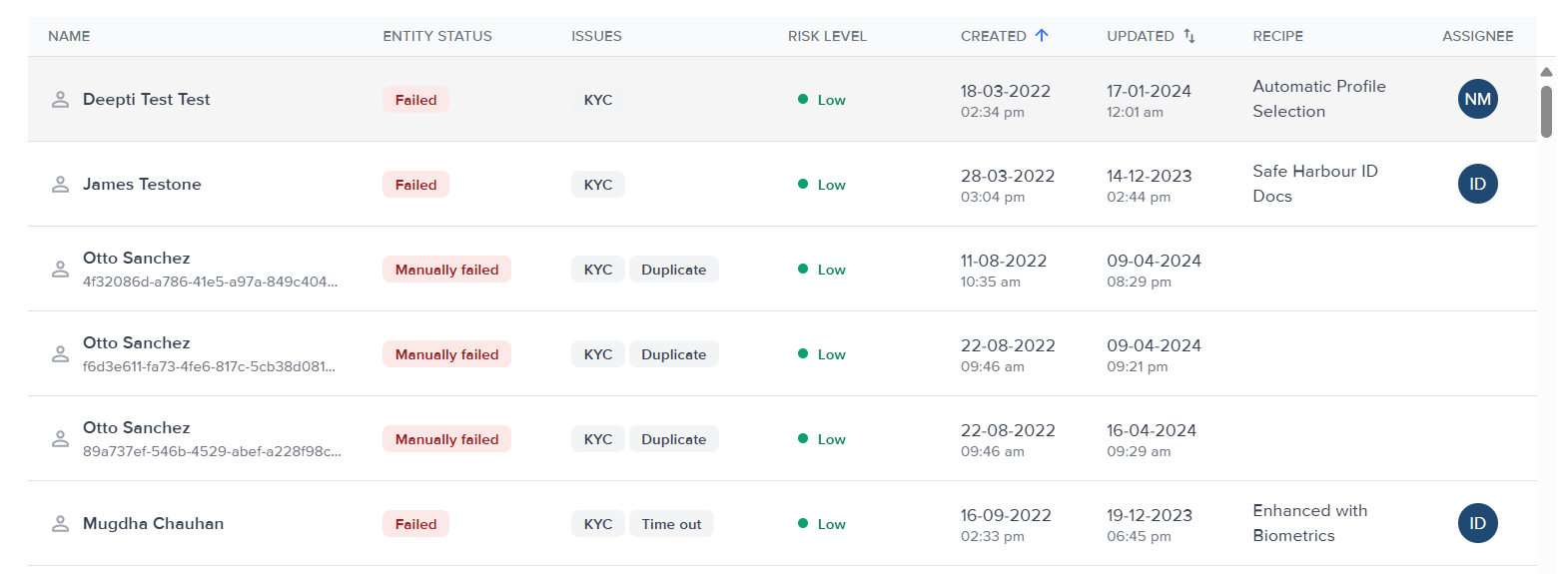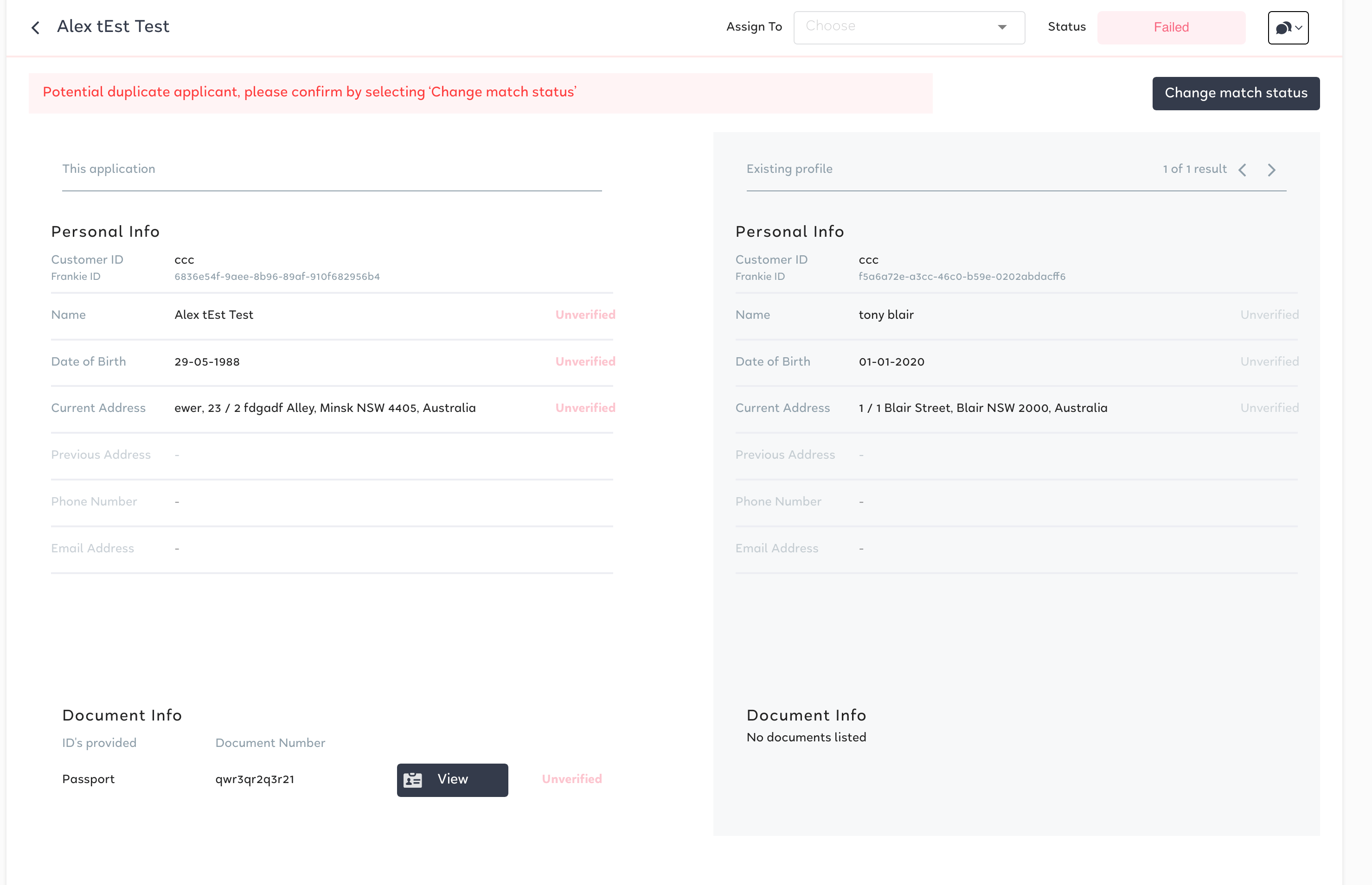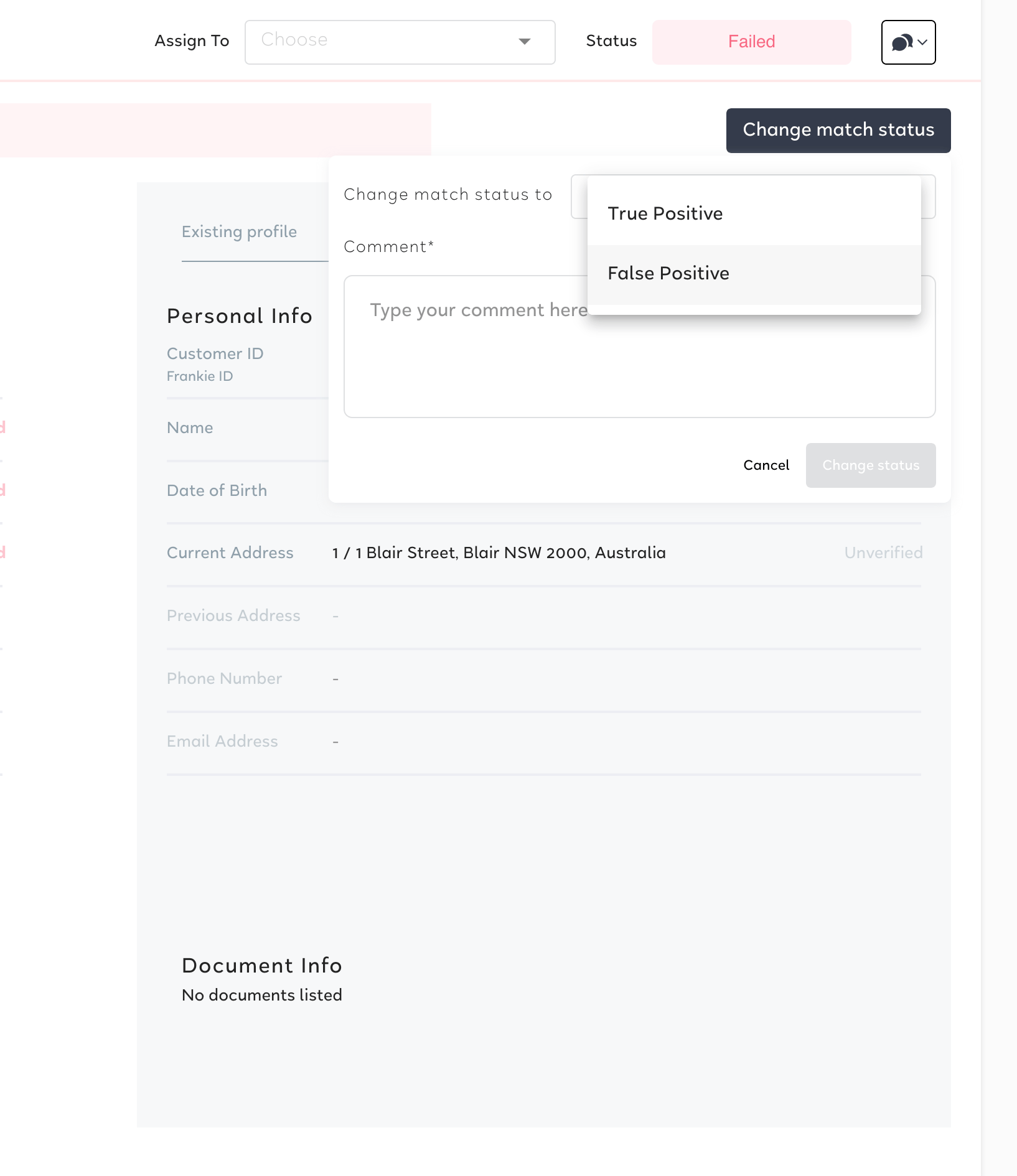 The client then becomes someone you can onboard via the Manual IDV page. If you select True Positive the client becomes a confirmed duplicate and can no longer be onboarded.
