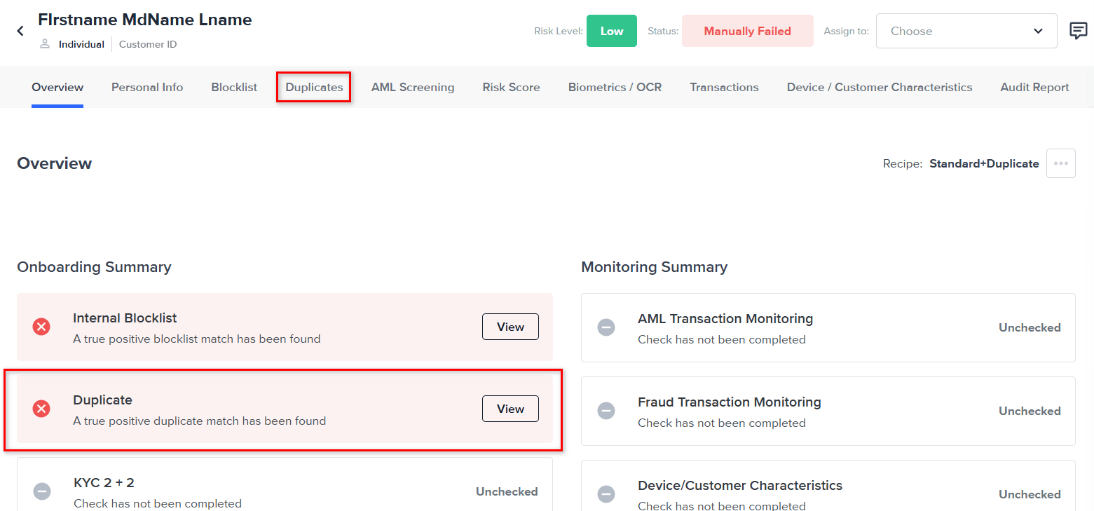If you want to look at the client and assess what the duplication is based on, select the user from the list. This will open the profile in the Overview tab. Select View on the Duplicate result in the Onboarding Summary section. Alternatively, open the Duplicates.