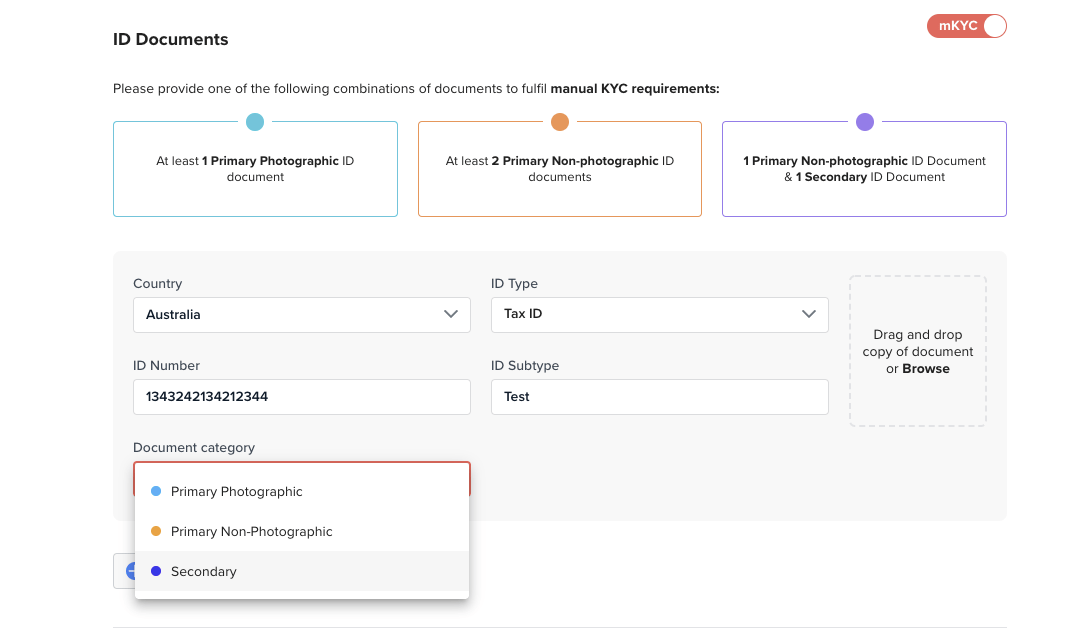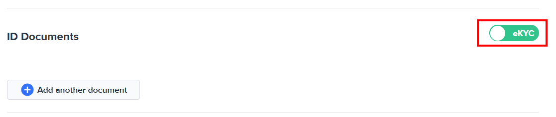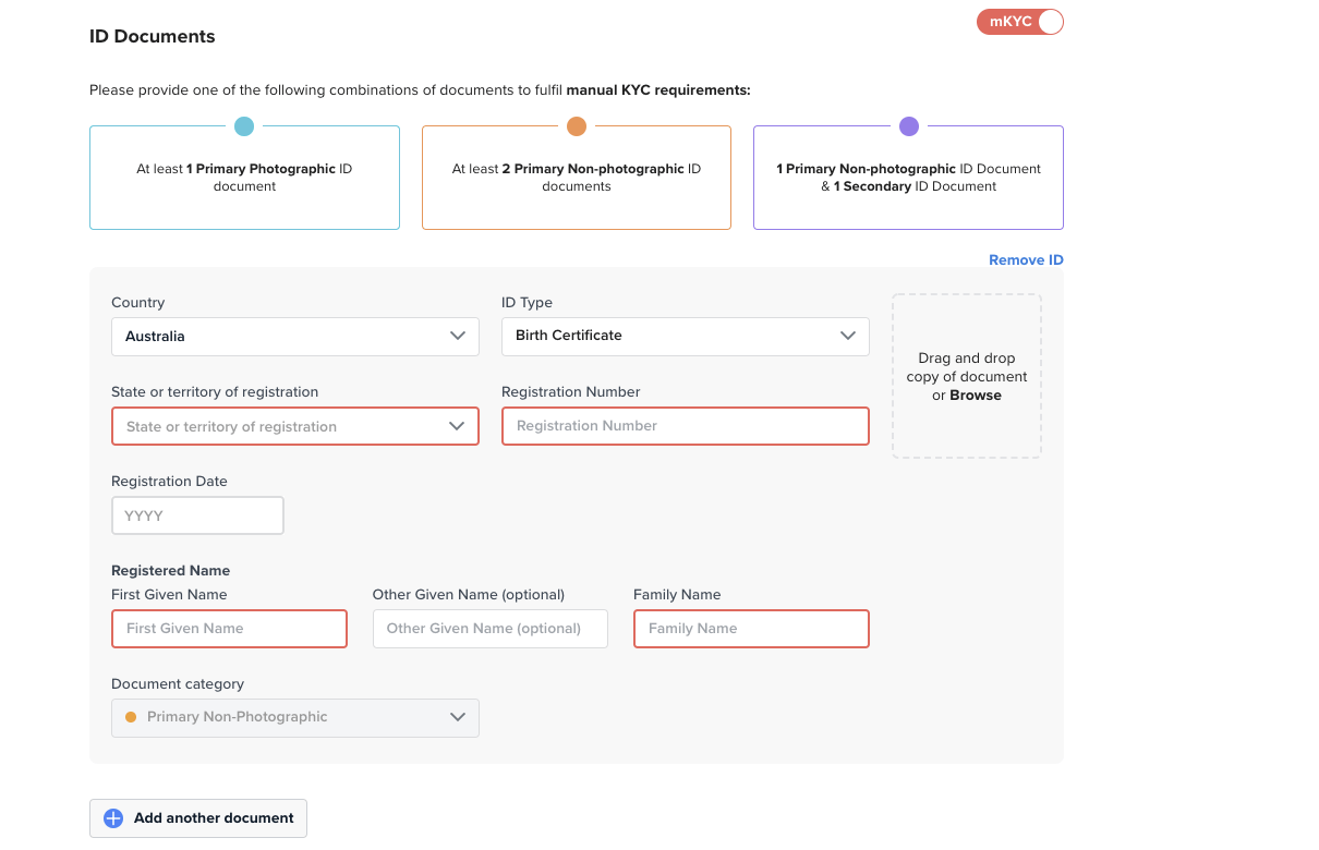 This will enable mKYC. Select the Add another document button to enter identification documents.