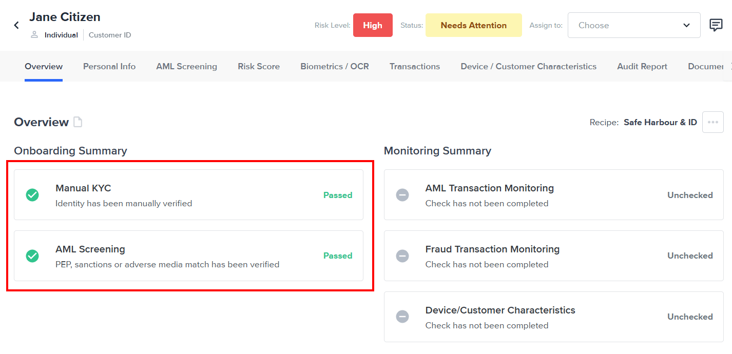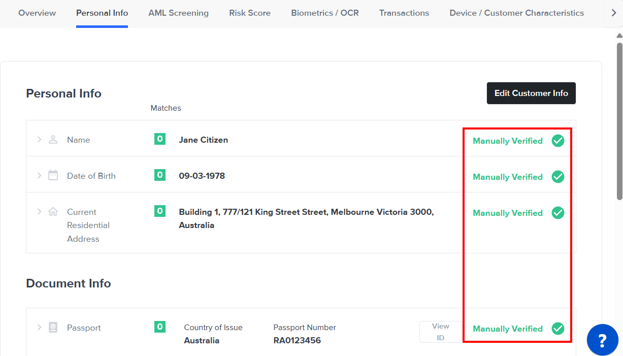 FrankieOne’s portal supports the ability to perform a manual KYC verification