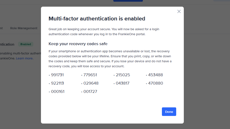 Once you’re done securing your recovery codes, select Done. An email will also be sent to your registered email address to inform you that you have enabled multi-factor authentication.