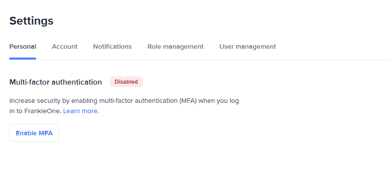 In the Settings page, select the Enable MFA button to open the Enable multi-factor authentication modal.