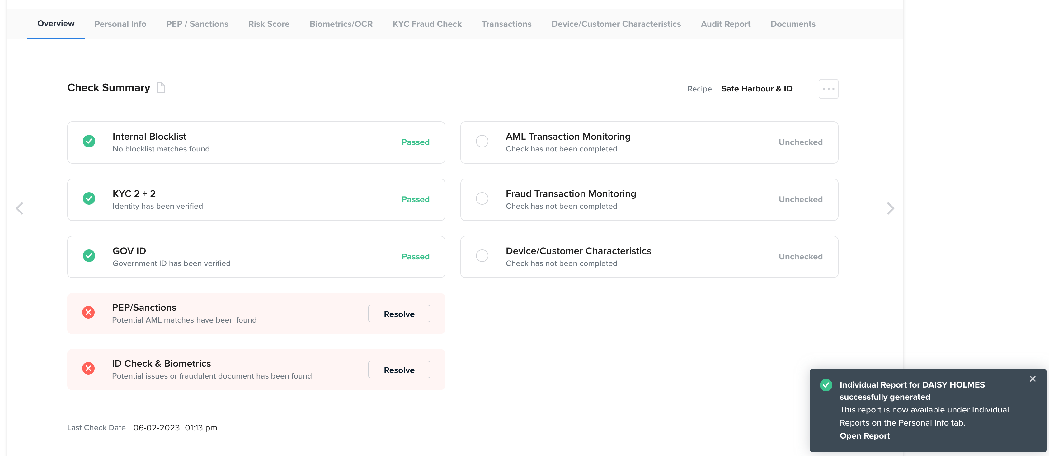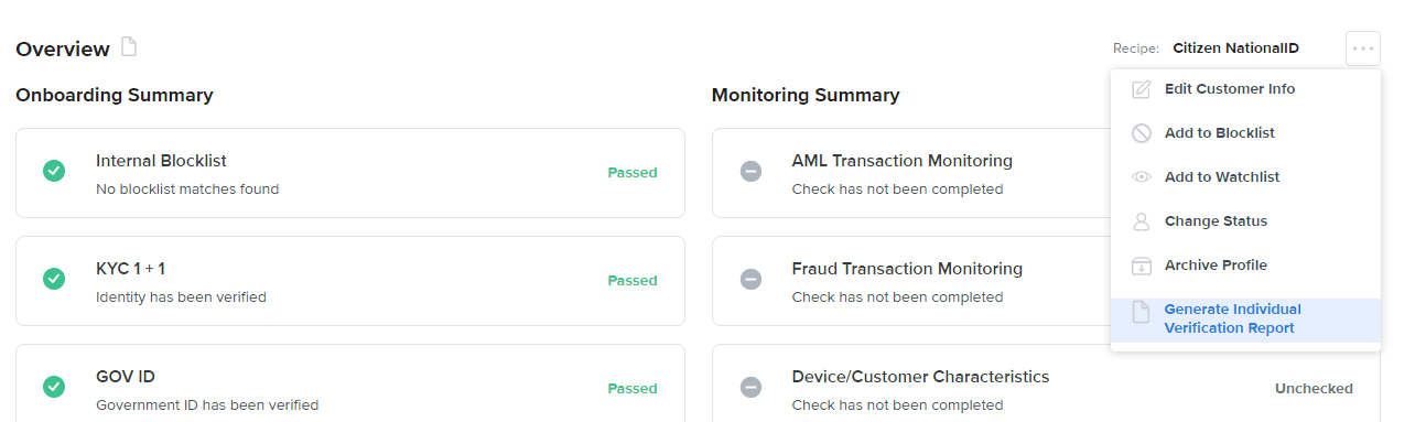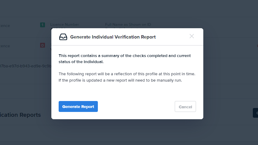 An Individual Verification Report is a snapshot of the latest results of checks run for an individual entity. The content of the report includes: